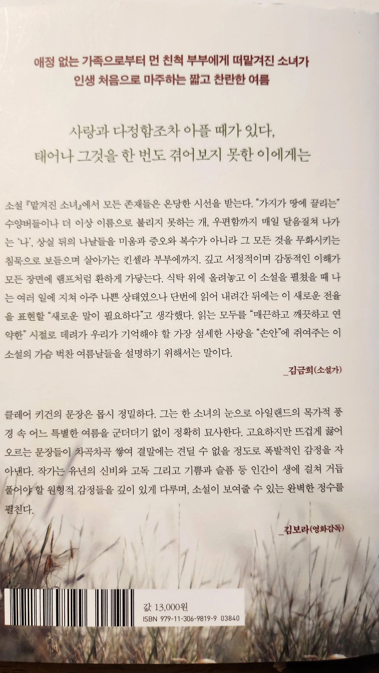 소설가 최은영은 '다정함이나 사랑이 누군가에게는 다시 아픔이 될 수 있음'을 이 소설을 통해서 보았다고 했다. 절대적으로 공감한다. 그래서 소녀는 그 갸녀린 시선을 마치 메타뷰를 장착한 듯, 전체를 조망하며 부모를, 킨셀라 아저씨 부부를, 불안한 존재 모두를 침묵한 채, 그저 바라만 보는지도 모르겠다. 말하지 못하는 것들, 말해지지 못하는 것들, 말없는 소녀로 살 것을 결심하게 도는 맡겨진 소녀의 이야기가 많이 아리다.