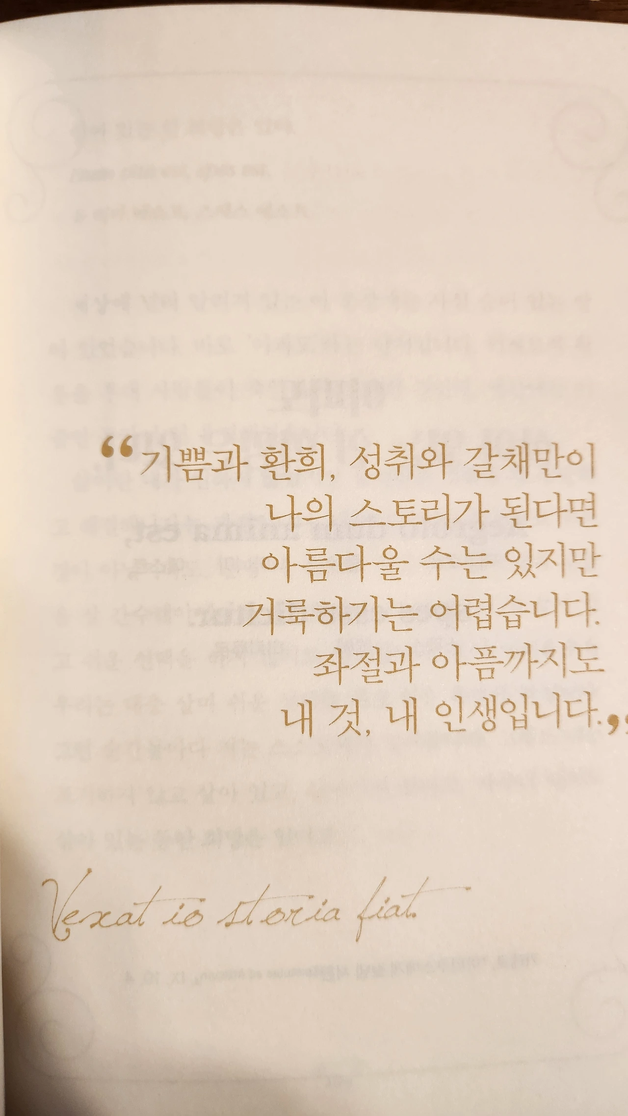 "기쁨과 환희, 성취와 갈채만이 나의 스토리가 된다면 아름다울 수는 있지만 거룩하기는 어렵습니다. 좌절과 아픔까지도 내 것, 내 인생입니다." '삶의 고비마다 나를 일으킨 단 한 줄의 희망'이라 부제를 붙인 문장에서 묵직한 울림을 느낍니다.