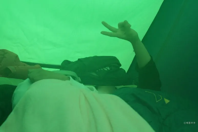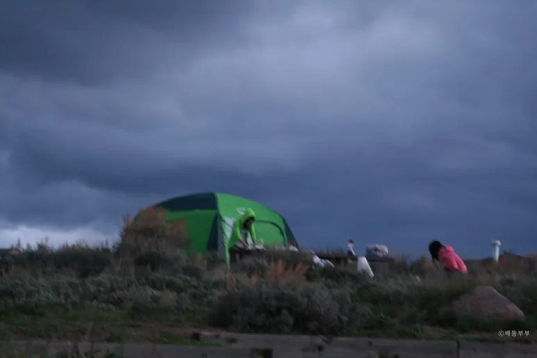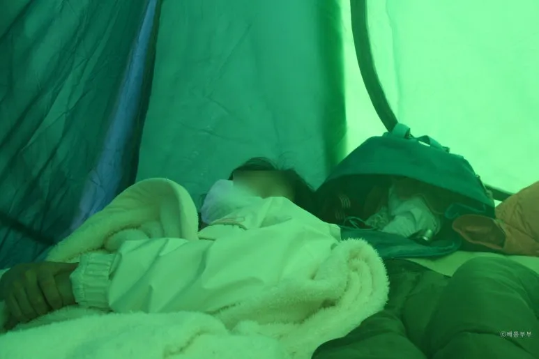 우리가 머물던 공간이 어둠에 서서히 물들기 시작하였다. 땅에 불꽃이 점점 사그라지면서 우리는 텐트 안으로 들어갔고, 수십만 가지의 대화들이 솟아 나왔다. 그리고 좁은 텐트 안에서 꼼짝없이 누워 잠에 들었다. 5월의 밤은 매우 차가웠다. 마스크나 두꺼운 겨울옷이 꽤 큰 도움이 되었다.