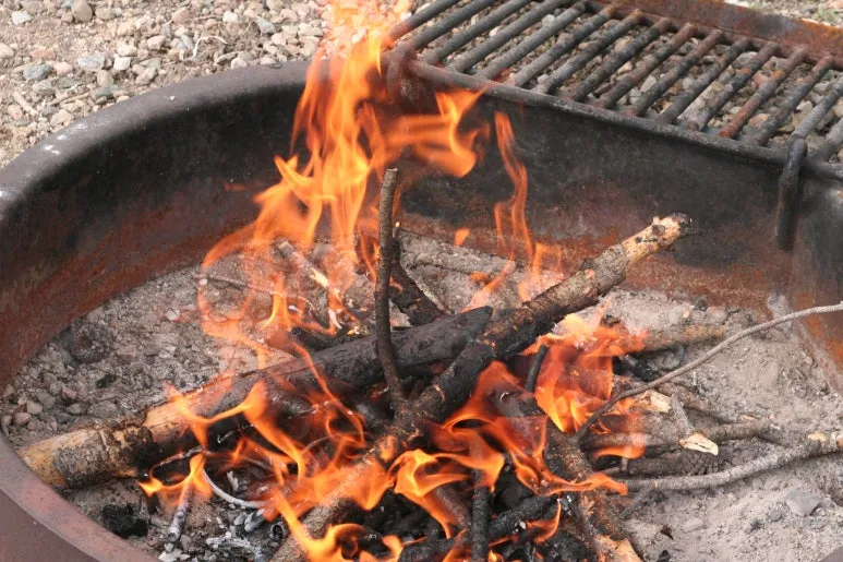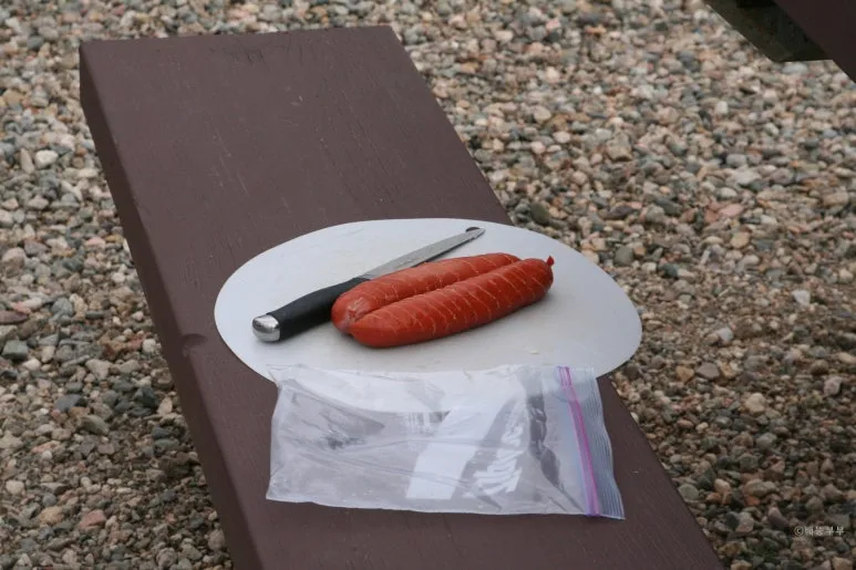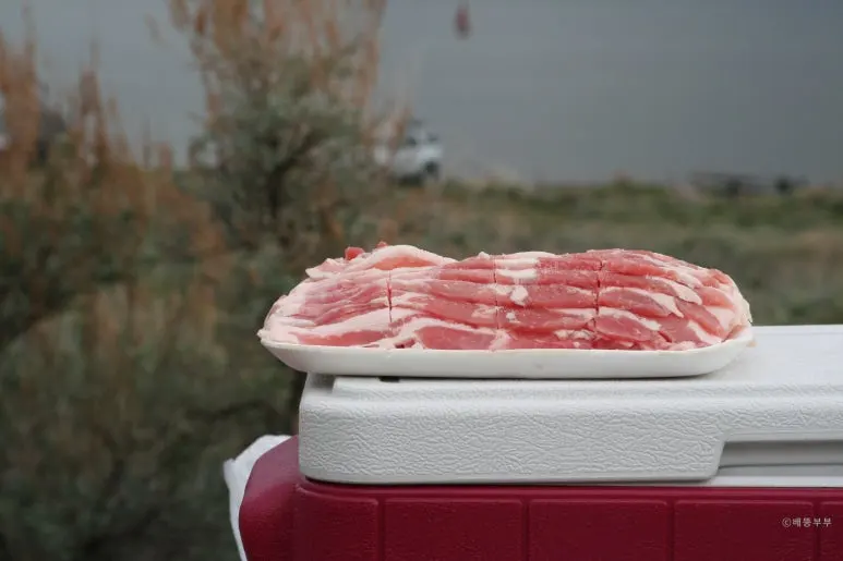 우리는 삼겹살, 고구마, 김치, 옥수수, 쌀 등을 준비해 갔다. 호일을 깔아주고 아이스박스에 담겨있던 삼겹살과 소시지를 꺼내어 지글지글 구워주었다. 삼겹살을 굽는 냄새와 흙먼지, 재잘거리는 소리들로 충만했던 공간이었다. 기름 튀는 소리와 고소한 냄새가 기억난다. 다른 캠핑족들은 강 부근에 자리를 잡았지만, 우리는 약간 높은 지대, 독립적인 공간에 머물렀기 때문에 편안했다.