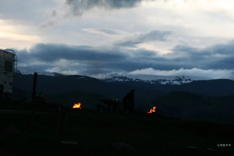 우리는 텐트를 설치하고 모닥불을 피우기 시작했다. 건조한 고산지대의 바람 덕에 불은 금세 타올랐다. 활활. 작은 나뭇가지와 풀잎, 흙을 모아 불씨를 살리고, 점차 큰 나뭇가지를 더해 불길을 키워갔다. 그 불길은 단순한 불이 아니었다. 내가 늘 그리는 기쁨의 축제였다. 기쁜 날의 축제. 기쁨의 환호성. 음악이 빠질 수 없었다. 삶의 축제 같은 현장에는 늘 음악이 함께 했다. 그 영롱한 소리는 모닥불의 열기와 함께 잘 어우러졌다. 사실 우리 넷의 관계는 쏘울 메이트까지는 아닌 그런 관계였다. 사람과 사람의 미묘한 거리와 감정들을 뒤로하더라도 이 아름다운 풍경을 소유할 수 있다는 사실이 더 기억에 남았으니, 오히려 나에겐 선물이었던 것이다.
