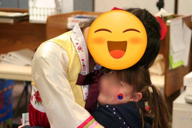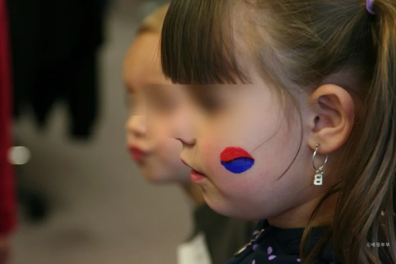 아이들의 얼굴에 대한민국 국기인 태극기를 그려주고