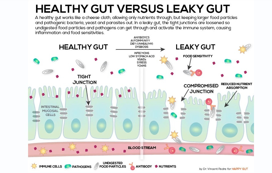 우리 몸의 면역체계 중 1차 방어막의 역할을 하는 장의 점막 세포는 단일 세포층으로 구성되어있고 세포 사이의 간극을 일정하게 유지하고 있다. 장 점막에 염증이 생기면 점막 세포들 사이의 간극인 치밀결합(tight junction)이 약해지면서 그 틈으로 여러 가지 물질들이 통과할 수 있는 소위 장누수(leaky gut) 현상이 생긴다 [11].