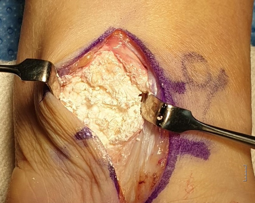 (사진 3. 손목 관절에 발생한 통풍결절 제거 수술 장면, 하얀 분필가루 형태인 요산결정체가 잘 보인다)