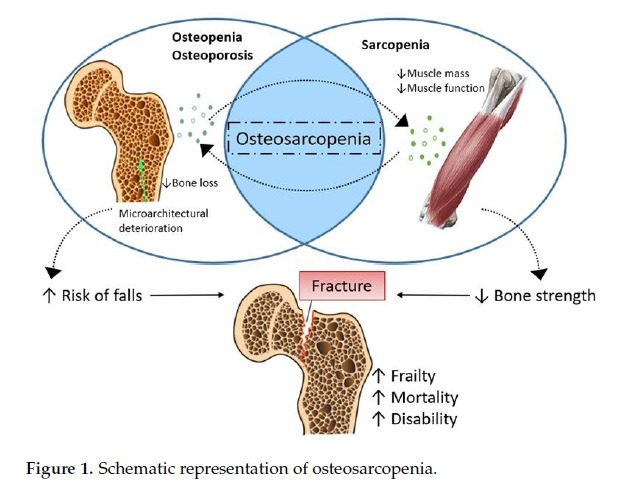 뼈와 근육은 관절, 힘줄, 인대 및 결합 조직과 함께 근골격계를 구성하므로 엄격하게 연결되어 있기에, 근감소증은 골다공증과 서로 따로 떨어진 문제가 아니라, 떼려야 뗄 수 없는 밀접한 관계에 있다. 근육 수축이 뼈에 전달하는 기계적 자극이 골 형성(osteogenesis)을 촉진하므로, 근감소증이 있는 사람은 골밀도 저하와 골절 위험이 증가하며, 반대로 골다공증 환자는 근육량과 근력 저하가 흔하다 [55].
