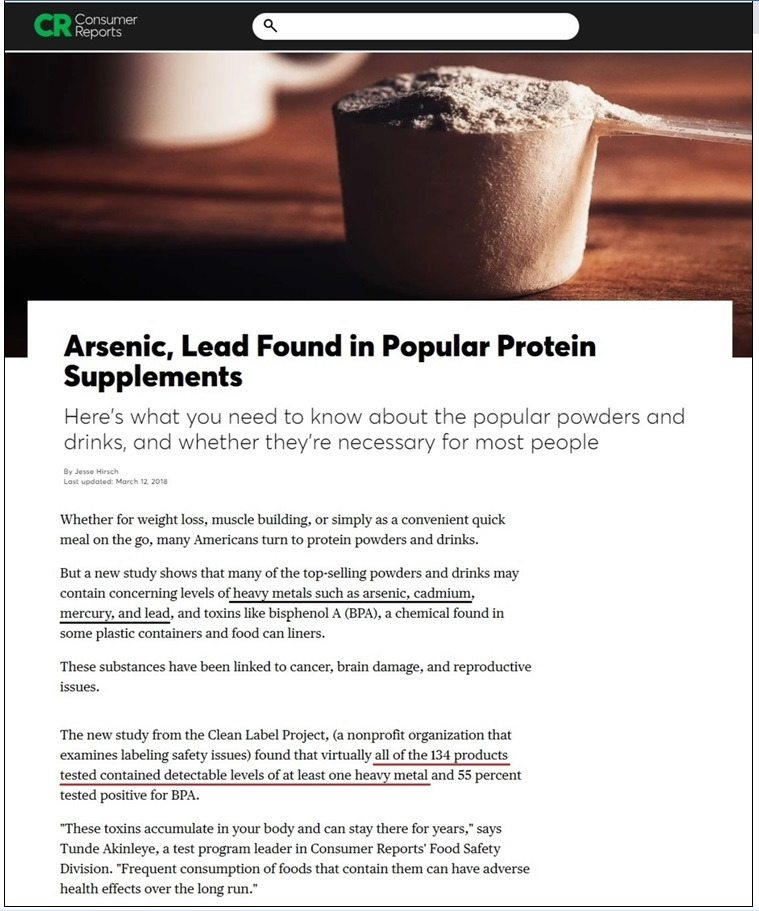 미국 내 영향력있는 소비자 단체인 컨슈머 리포트(Consumer reports)에서 2018년 미국 내 판매 중인 134개의 단백질 보충제에 들어있는 비소, 카드뮴, 수은, 납 등 중금속을 조사한 결과, 134개 제품 모두에서 1개 이상의 중금속이 검출되었다는 놀라운 보고를 했다. 이런 중금속들은 몸 밖으로 배출이 잘 안되어 오랫동안 몸속에 머물기에 암, 치매, 불임 등을 야기할 수 있다 (아래기사) [27].