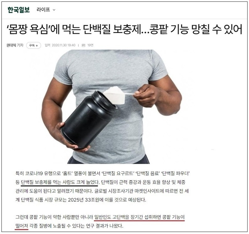 고령화 사회에 접어들면서 노인의 근감소증 예방 및 건강 유지를 위해 단백질을 많이 먹어야 한다는 정보가 범람하고 있다. 식사로 부족할 경우 단백질 보충제를 먹어라는 말도 한다.