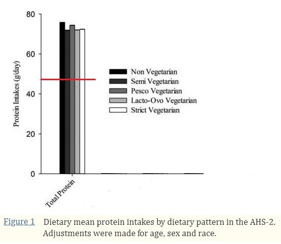 미국 국립 보건원(NIH)의 후원으로 식단에 따른 영양소 수치를 측정한 연구가 있다. 약 7만명을 대상으로 5개 그룹(잡식,준채식,페스코,락토오보,비건)의 식단을 조사한 결과, 어떤 종류의 식사를 해도 단백질은 부족하지 않았고, 비건(완전채식, strict vegetarian)인 경우에도 육식을 하는 사람들과 비슷한 단백질 섭취량을 보였다 (*아래 그래프 -> 식사 종류에 관계없이 모든 군에서 기준 체중 60kg 성인의 단백질 하루 권장량인 48 gram(RDA: 0.8g/kg/day)을 초과하고 약 50% 더 섭취했다.) [13].