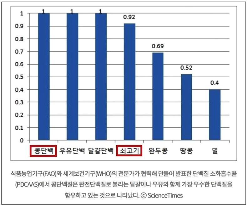 미국 식품의약청(FDA)이 단백질의 품질을 평가하는 방법으로 도입한 '단백질 소화율 보정 아미노산 점수(PDCAAS)'에 따르면 콩단백질은 '완전 단백질'로 불리는 우유나 계란과 함께 1점으로 가장 우수한 단백질로 판정받았다. 반면 쇠고기는 0.92점이었다 (아래 도표) [17].