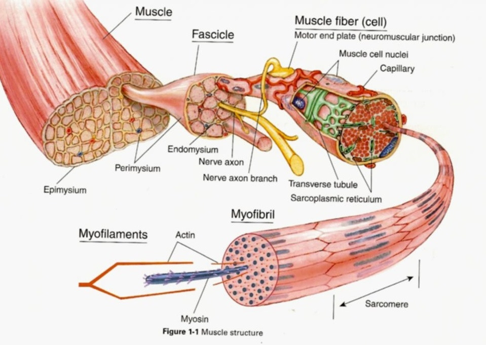 근육은 수많은 가닥의 근섬유(Myofibril)로 구성돼 있다 (아래 그림) [42].