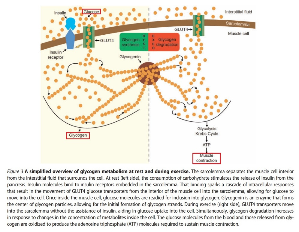 예를 들어, 체력의 한계에 도전하는 마라톤 선수들은 시합 3-4일 전부터 단백질이 아닌 탄수화물 섭취를 대폭 늘려 '카보로딩', 정확히는 탄수화물 로딩(Carbohydrate Loading)을 한다. 운동에 필요한 에너지원은 단백질이 아니라 포도당이기 때문이다. 쉽게 말해 차와 비교하면, '연료탱크'인 간과 근육에 '휘발유'인 탄수화물을 꽉 채워놓는 과정이다. 연료탱크가 가득차면 차가 오래가듯이, 글리코겐(탄수화물 저장 형태)이 많으면 운동을 오래 할 수 있다. 운동 후에도 탄수화물 섭취를 충분히 해야 회복이 빨라진다 (*아래 그림 -> 좌측은 휴식시 근육내의 포도당을 이용해 글리코겐이 합성되는 과정. 우측은 운동시 글리코겐이 분해되면서 포도당을 유리하고 에너지(ATP)를 생산해 근육이 수축되는 과정.) [35,36].