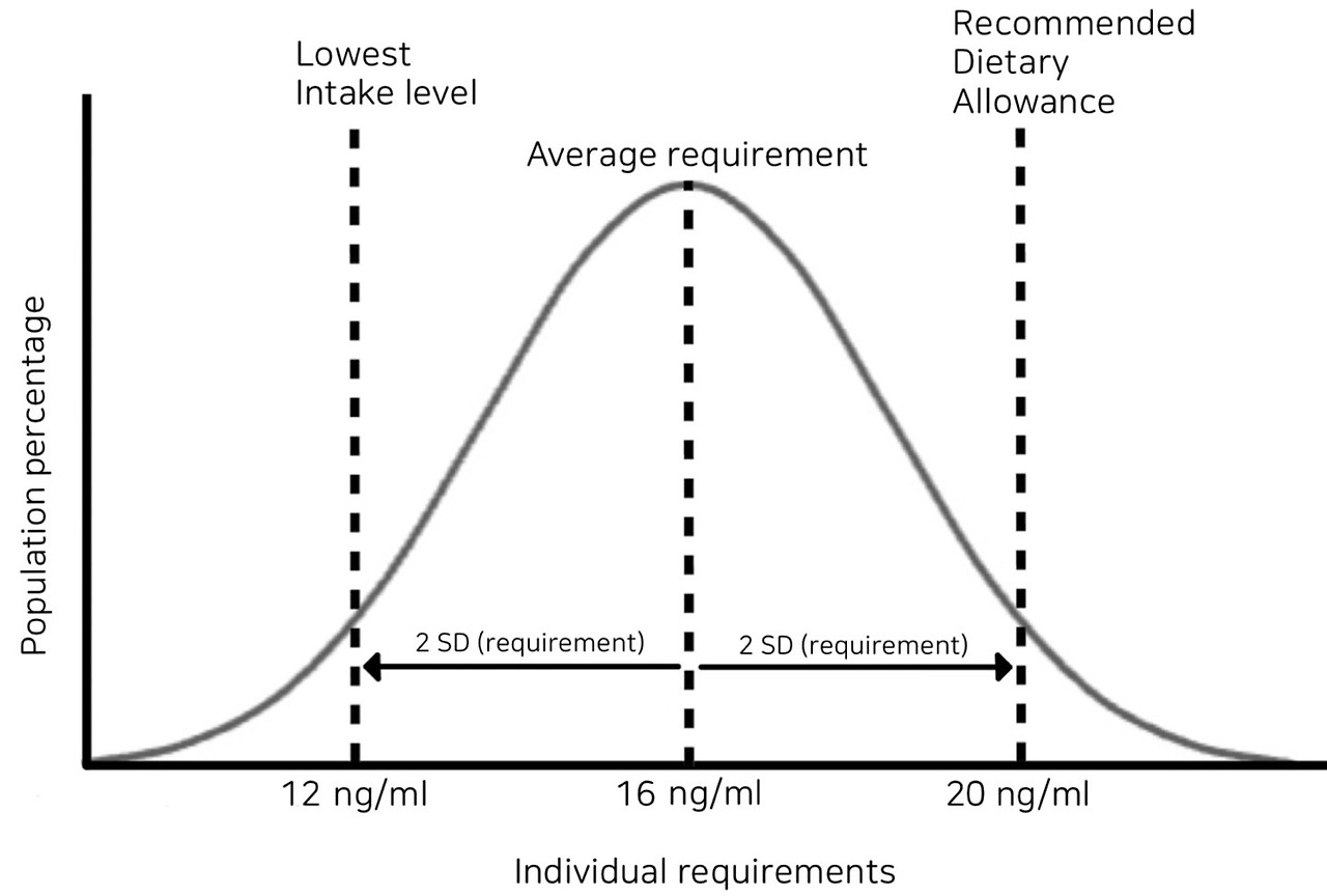 그래프에서 보듯이 건강한 성인 대부분(97.5%)의 필요량을 만족시키는 섭취량 RDA인 비타민 D 혈중농도 20 ng/ml를 비타민 D 부족의 기준점(cut point)으로 잡는 오류로 인하여 팬데믹 사태가 생긴 것이다. 실제로는 lowest intake level 인 12 ng/ml 이하를 부족의 기준점으로 잡아야 한다. 즉 기준점을 너무 높게 잡은 게 문제였다. 일반인의 건강에 필요한 적절한 권장량은 평균필요량(EAR)인 16 ng/ml이고, 12-20 ng/ml는 정상 수치다. 따라서 현재의 비타민 D 팬데믹 사태는 2011년 발표된 미국의학원(IOM)의 보고서를 잘못 해석하고, 잘못 적용한 결과다 [12].