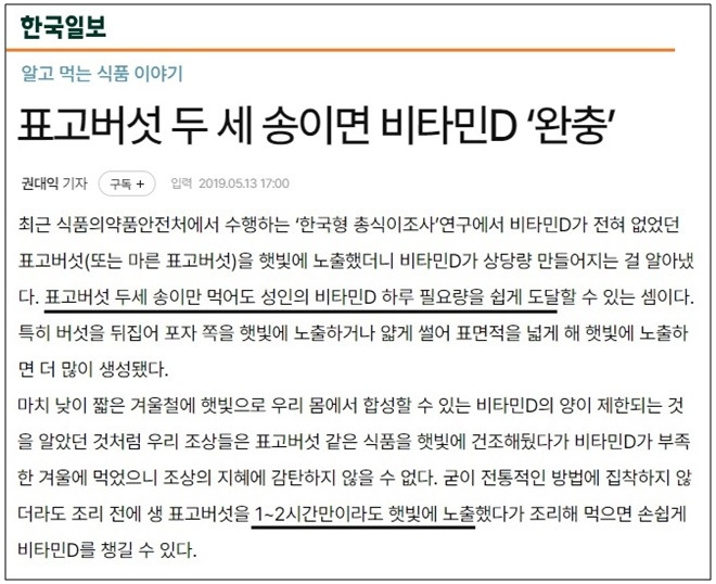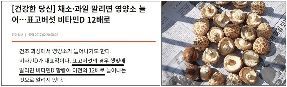 식물성식품에도 비타민 D가 많은 게 있다. 우리가 흔히 먹는 버섯이다 [53,54,55,56]. 표고버섯, 느타리버섯 등을 햇볕에 1-2시간 말리면 상당량의 비타민 D가 만들어진다.