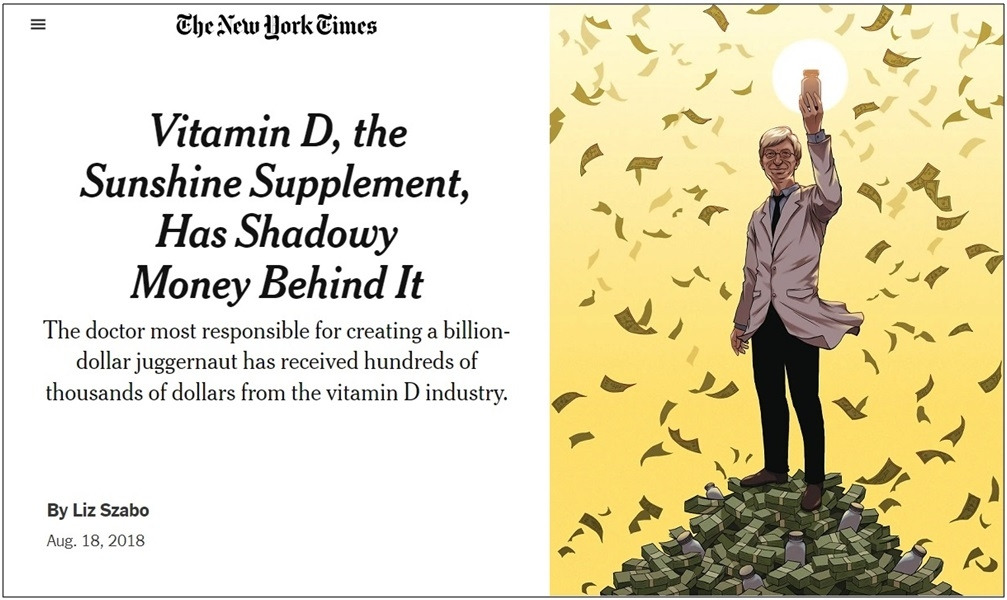 '비타민 D 전도사'라 불리며, 미국 내분비학회의 정상 수치 하한선을 30 ng/ml 이상으로 높게 세워, 미국인 80%를 졸지에 비타민 D 부족 환자로 만든 후, 비타민 D 시장을 폭발적으로 성장하게 만들었던 미국 보스톤대학 내분비학 마이클 홀릭(Michael Holick) 교수가 비타민 D 제약업체 및 진단기기 생산업체, 심지어는 태닝기계 회사로부터도 거액의 후원금을 받고 있다는 사실이 2018년 뉴욕타임스에 폭로되면서 다시 한번 비타민 D 정상수치에 대한 논란이 생겼다. 비타민 D도 결국 '질병장사'의 범위를 벗어나지 못하였다 [26].