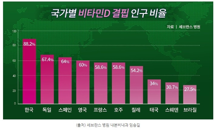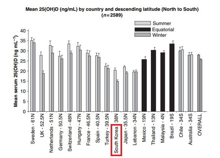 저명한 의학저널 중 하나인 ‘Journal of Internal Medicine’에서 2006년 유럽, 남미, 중동, 아시아 및 호주 등 위도가 다양한 지역 18개국 약 2600명의 폐경 후 여성을 대상으로 측정한 비타민 D 연구에서, 부족으로 진단된(30 ng/ml 이하) 인구의 빈도는 한국 92%로 단연 1위였다 [1].