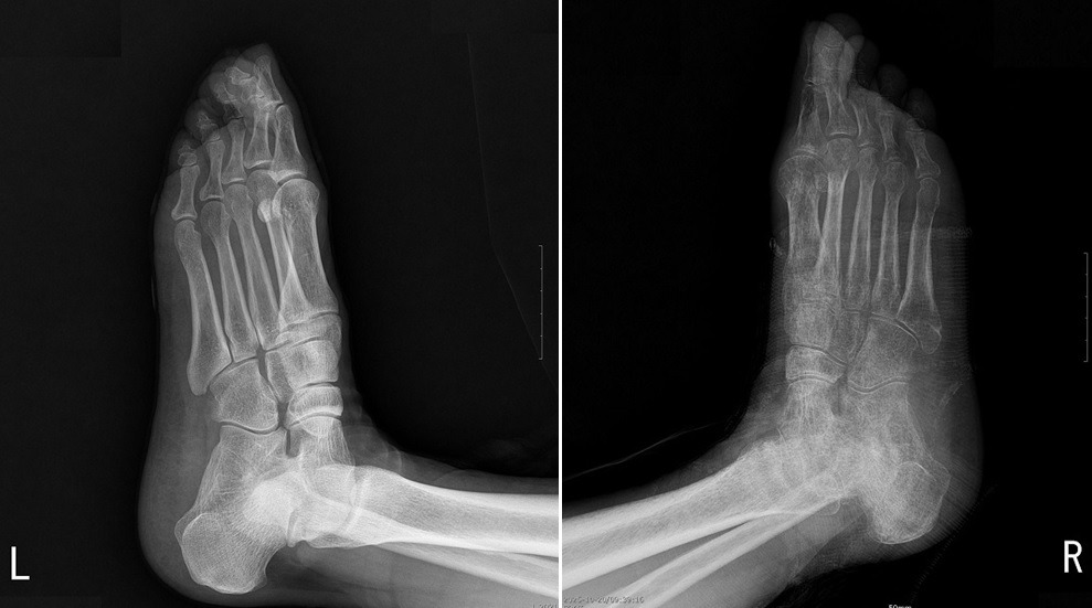(*사진 설명 -> 우측 새끼 발가락 골절로 개인 의원에서 3개월간 부목고정으로 골절은 치유되었으나, '체중부하운동'이 전혀 안된 53세 여성으로 좌측 발 X-선 사진에 비해 우측 발 사진은 피질골이 얇아지고 골밀도가 현저히 감소된 심한 골다공증 소견을 보이고 있다. 장기간 사용하지 않아 뼈가 약해진 것이다.)