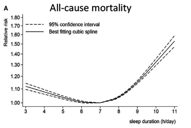 수면 또한 뼈에 절대적인 영향을 미친다. 정상 성인은 약 7시간 가량의 수면이 필요하다. 5시간 이하의 수면은 7시간 수면에 비해 골밀도가 유의하게 낮았다 [55]. 왜냐면 수면 중에 뇌가 노폐물 제거 작업을 하듯이, 뼈도 수면 중에 낡은 뼈를 없애는 파골세포와 새로운 뼈를 만드는 조골세포가 작업을 해 건강한 뼈를 만들기 때문이다. 하지만 더 많이 잔다고 좋은 건 아니다. 7시간 이상 수면은 오히려 사망률을 높인다. 수면과 사망률은 U-shape 관계를 보인다 (아래 그래프) [56].