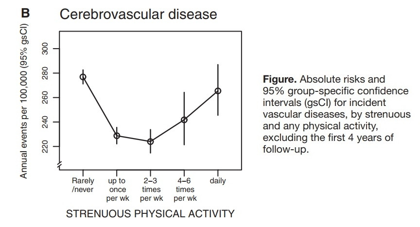 영국 옥스퍼드 대학에서 운동과 각종 심혈관 질환과의 관계를 조사한 대규모 연구에서 심근경색, 뇌졸중, 정맥혈전색전증 발생이 운동을 매일 한 군보다 일주일에 2-3번만 한 군에서 유의하게 적게 나왔다 (아래 그래프) [35]. 조깅 정도와 사망률 간의 관계를 조사한 덴마크연구에서도 주당 3회 이상 뛴 군보다 2-3회 군에서, 주당 2.5-4시간 조깅 한 군 보다 1-2.4시간 조깅한 군에서, 빠른 속도로 뛴 군보다 가볍게 또는 중간 속도로 뛴 군에서 사망률이 더 낮게 나왔다 [36]. 따라서 운동은 많이 할수록 좋은 게 아니라 적당히 하는 게 건강에 좋다. 다다익선(多多益善)이 아니라 과유불급(過猶不及)이다.