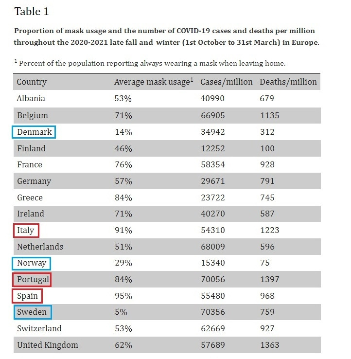마스크 착용률이 30% 미만이었던 덴마크, 노르웨이도 착용률 80% 이상인 이태리, 포르투갈에 비해 사망자 숫자가 낮게 나왔다. 즉 마스크로 코로나의 전파를 막을 수 없었고, 오히려 결과에 악영향을 끼쳤다고 평가했다(the universal use of masks may have had harmful unintended consequences) [12].