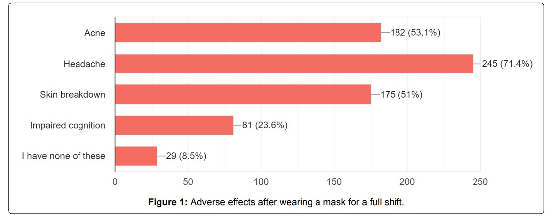 미국의 저명한 뉴욕 프레스비테리안 병원의 보고에 의하면 의료 종사자(의사, 간호사 등)의 약 70%가 마스크 착용으로 인한 두통을 겪어 진료 활동에 지장을 느낀다고 했다(아래도표)[42]. 신체뿐 아니라 정신적으로도 공감능력이 저하되어 만약 의사가 진료 중 마스크를 하면 환자와의 공감 능력이 떨어져 상호 신뢰 관계에 악영향을 끼친다 [43].