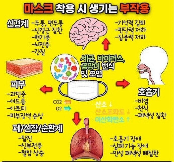 마스크란 예나 지금이나 증상이 있는 환자가 타인에게 전파 방지 목적으로, 또는 수술실이나 치과에서 튀는 환자의 체액을 막는 용도로 쓰는 도구다. 특정 장소에서 하는 단기간 마스크 착용과 지역사회에서 하는 장기간 마스크 착용은 다르다는 것을 이해해야 한다. 장기간 마스크 착용은 다양한 부작용을 야기하기에 국가든 개인이든 타인에게 마스크 착용을 강제하는 것은 '자유롭게 숨 쉴 권리'를 빼앗는 일이기에 자유민주주의 사회에서 옳은 일이 아니다. 마스크를 오래 착용할수록 만성 저산소증으로 인해 당신의 심폐기능은 떨어지고, 면역기능도 약해지고, 심지어는 암 발생을 증가시킨다 [53,54].