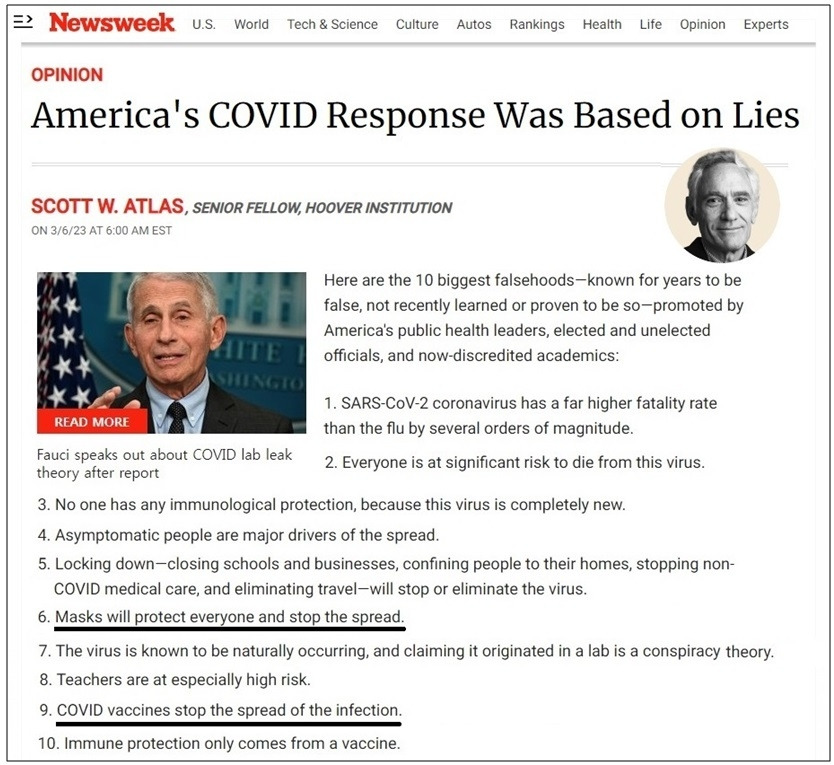 최근(2023년 3월) 미국 주요 언론사 중 하나인 뉴스위크지에서도 지나치게 강력했던 코로나19 방역은 현대사에서 가장 규모가 크고, 가장 비극적이고, 가장 비윤리적인 실패한 보건정책이라고 했는데 특히 락다운, 백신, 마스크가 코로나 전파를 막을 수 있다고 대중을 선동한 것은 명백한 거짓말이었다고 지적했다 (아래기사) [58].