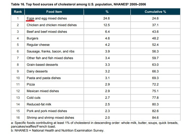 계란과 콜레스테롤과의 관계를 연구한 논문 66개를 메타분석한 보고에 의하면, 계란 섭취는 LDL 콜레스테롤 수치를 유의하게 높이는 것으로 확인되었다 [22]. 미국암연구소에서 발표한 '콜레스테롤 증가시키는 음식'에서도 1위는 계란이고, 2위 치킨, 3위 소고기 그 외에 치즈, 가공육, 생선 등 이다 (아래도표) [23].