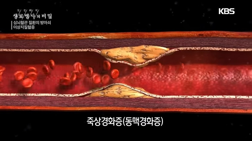 기름 성질을 가진 콜레스테롤의 양이 많아지면 기름때가 끼듯 동맥 혈관의 가장 안쪽인 내막에 쌓이고, 시간이 갈수록 죽처럼 걸쭉한 상태에서 점점 굳어져 플라크가 되어 혈관이 좁아지는 현상을 죽상경화증(atherosis)이라 한다.