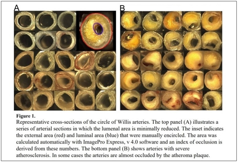 위 사진은 뇌 기저면의 동맥혈관을 부검한 사진이다. 정상인의 뇌동맥(A)에 비해 알츠하이머 환자의 뇌동맥(B)은 지방 침착으로 인한 심한 죽상동맥경화증으로 직경이 훨씬 좁아져있고 심지어는 막히기 일보직전이다 (여러분은 자신의 뇌 속에 어떤 동맥을 갖기를 원하는가?) [35].
