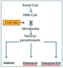 코큐텐(coenzyme Q10, CoQ10)이라는 물질이 있는데 이것은 세포 내 ‘에너지 공장’인 미토콘드리아에서 포도당과 산소를 이용하여 에너지인 ATP를 만들 때 꼭 필요한 효소다. 코큐텐은 인체의 모든 세포에 존재하나 특히 에너지를 많이 필요로 하는 심장, 뇌, 간, 근육 등에 많이 분포한다. 스타틴이 간에서 콜레스테롤 합성을 억제할 때 심장기능에 중요한 코큐텐 합성도 동시에 억제한다 (아래그림) [68].