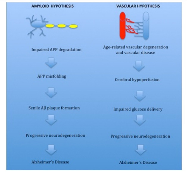 전통적으로 치매의 원인으로는 두가지 학설이 있다. 아밀로이드(amyloid)라는 독성이 있는 작은 단백질이 뇌에 침착되면서 뇌 세포에 유해한 영향을 주는 ‘아밀로이드 가설’과 뇌로 가는 혈액순환 장애가 원인이라는 ‘혈액순환 가설’이다(두 가설 비교 -> 아래 그림) [21].