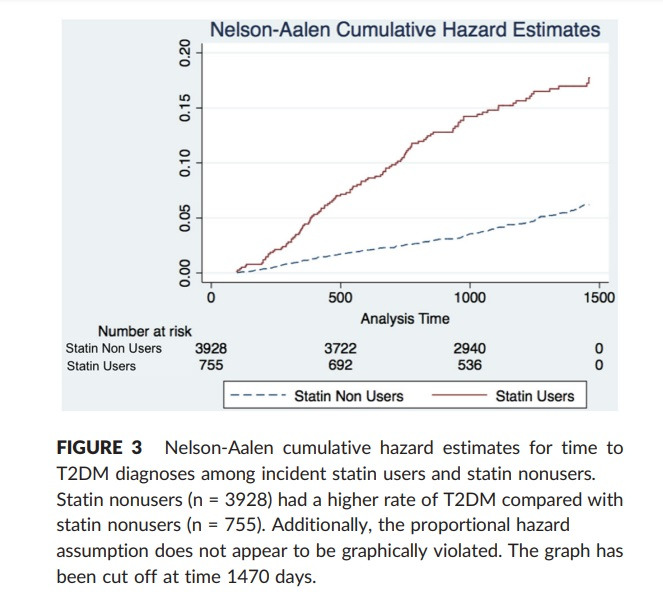 미국에서 약 16만명의 여성을 대상으로 최소 3년간 스타틴 복용자와 비 복용자 간의 당뇨 발병률을 조사한 결과 스타틴 복용군에서 당뇨 발병률이 인종에 따라 50-70% 더 증가했다고 한다 [57]. 스타틴 복용자는 비 복용자에 비해 당뇨 발생률이 2.2배 더 증가했고, 2년이상 사용자는 3.3배 더 증가했다 (아래 그래프) [58].