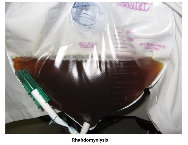 가장 심각한 것은 근육통과 함께 근육이 분해되는 횡문근융해증(Rhabdomyolysis)으로 근육 세포가 죽어버려 '코카콜라 색깔'의 오줌을 누는 등 이상 증상을 동반한다 (아래 사진).