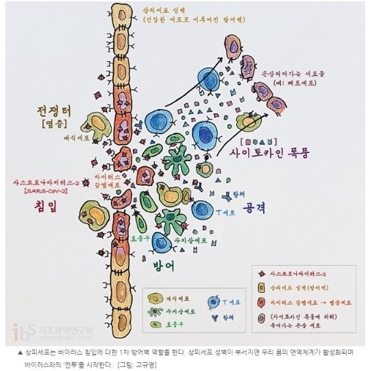 인체에는 3차에 걸친 촘촘한 면역 시스템이 있다. 1차 방어는 호흡기 점막에서 인터페론 등으로 유해 바이러스를 차단한다 [29]. 만약 1차 방어선인 점막의 상피세포 벽이 무너지면 백혈구가 모여들면서 바이러스와의 전투인 2차 방어가 시작된다 (아래그림). 면역세포 집단인 백혈구(중성구,호산구,호염기구,단핵구,림프구,NK세포)가 총 출동하여 히스타민이나 사이토카인 등의 화학물질을 분비하여 염증 반응을 일으켜 모세혈관을 확장하고, 혈액순환을 촉진하고, 몸에 열이 나게 해서 바이러스의 번식을 저지한다 [30].