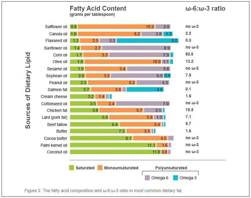 참고로, 식품에는 오메가-3 나 오메가-6 중 한가지만 있는 경우도 있지만 둘이 섞여 있는 경우가 더 많다(아래도표) [37].