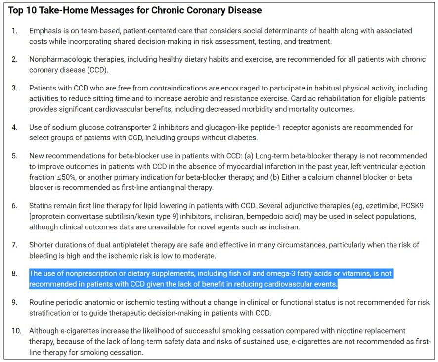 그런데 최근(2023년 7월) 미국심장협회(AHA)와 미국심장학회(ACC) 등 6개의 주요 의학단체가 ‘만성 관상동맥질환자 관리지침’ 개정을 통해 “오메가-3 보충제 사용이 심혈관질환 위험을 낮추는 데 이득이 없어 권장하지 않는다”고 발표했다 (아래요약 8번)[5]. (* 관상동맥질환이란 심장에 혈액을 공급하는 동맥이 좁아지거나 막혀 혈액 공급이 이뤄지지 않아 발생하는 질환으로 협심증과 심근경색이 대표적이다.)