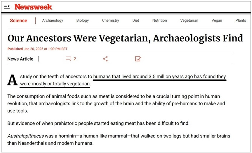 350만 년 전에 살았던 인류의 초기 조상인 오스트랄로피테쿠스의 치아에서 발견되는 질소 동위 원소를 분석한 결과, 그들은 대부분 또는 완전히 초식성이었다. 이 놀라운 연구는 미국 Newsweek 지에도 기사로 발표되었다 (아래기사) [60].