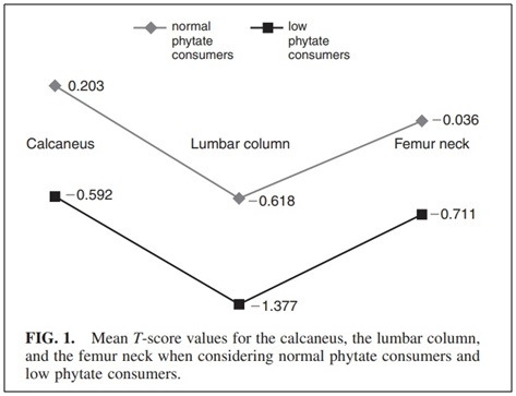칼슘 섭취가 부족해져 골다공증이 생길거라고 주장하지만, 실제로는 정반대로 피틴산 섭취가 많을수록 뼈는 더 튼튼해지고, 피틴산 섭취가 적을수록 뼈는 약해진다 (*아래 도표 설명; T-score는 골밀도를 평가하는 수치로, 수치가 낮을수록 뼈가 더 약하다는 의미다. Calcaneus(발뼈), Lumbar(허리뼈), Femur neck(대퇴뼈)에서 피틴산 섭취가 적은 사람의 T-score 수치가 낮았다) [9].