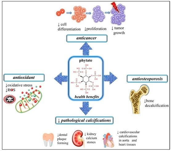 최근(2023년) 발표된 피틴산과 건강에 대해 지금까지 나온 중요 논문 70개를 분석한 결과도 피틴산은 항산화, 항암, 항석회화, 항골다공증 효과가 있어 몸에 좋은 성분이라 했다 (아래그림) [38].