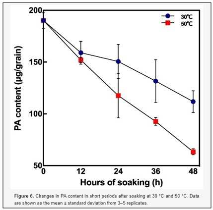 그럼에도 불구하고 여전히 피틴산을 꺼리는 분들은, 현미 섭취를 포기할 게 아니라 피틴산 함량을 줄이는 방법을 쓰면 된다. 피틴산은 열에 강해 가열해도 없어지지 않지만, 물에는 쉽게 분해되는 특성이 있다. 현미쌀을 30도 물에 이틀 동안 불리면 40%의 피틴산이, 50도 물에서는 70%의 피틴산이 감소한다 (아래그래프, PA -> Phytic acid) [40].