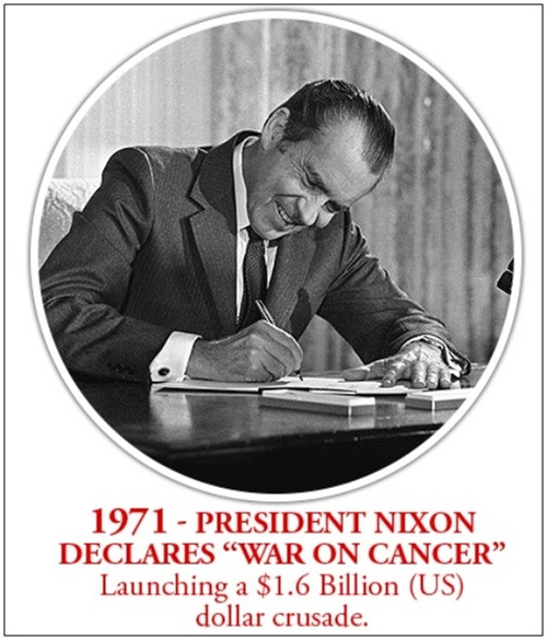 크리스마스 이브를 하루 앞둔 1971년 12월 23일, 미국 닉슨 대통령은 '암과의 전쟁'을 선포하고 국가암퇴치 법(national cancer act)을 제정하였다. 국가적 차원에서 암 연구에 대한 전폭적 지원으로 5년 뒤 미국독립 200주년인 1976년까지 암을 퇴치하겠다고 자신있게 발표했다.