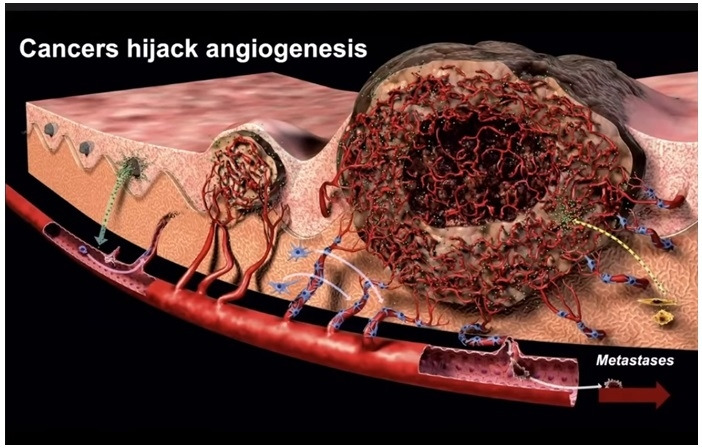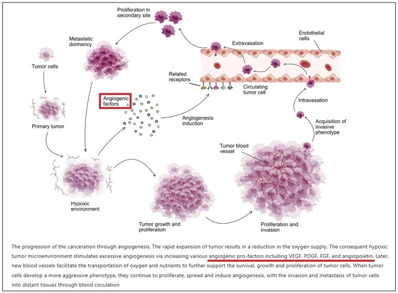 혈관이 좁아져 혈액 공급이 잘 안되면, 잠복해 있던 미세암 주변에도 산소가 부족해지고, 이런 상태가 오래 지속되면 VEGF 분비가 증가되면서 혈관신생을 촉진하여 암이 성장한다 (아래그림) [16].