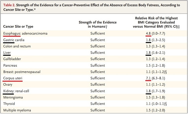 2016년 WHO 산하 국제암연구기관((IARC)에서 비만과 암 발생률을 조사한 결과를 최상위 의학지인 NEJM에 보고했다. 비만인은 정상인에 비해 자궁암 7.1배, 식도암 4.8배, 위암 1.8배, 간암 1.8배, 신장암 1.8배 더 많이 발생했다 (아래도표) [43].