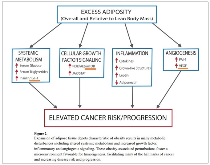 비만하면 암이 잘 생기는 이유는 다양하게 있지만 그중 대표적인 것은 암세포의 증식을 돕는 호르몬인 인슐린유사성장인자(IGF-1)의 과다 분비(*IGF-1 상세설명 -> https://brunch.co.kr/@mhsong21/51 ), 세포의 성장과 분화에 작용하는 m-TOR 신호의 활성화, 혈관신생을 야기하는 물질인 VEGF 분비 증가이다 (아래도표) [44].
