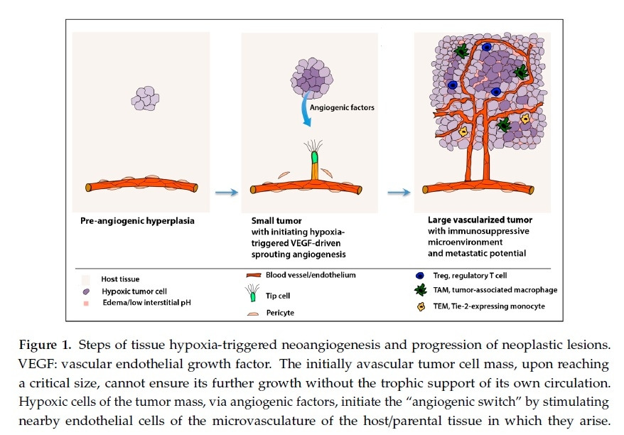 만약 암세포 주변환경이 만성적인 저산소증에 빠지면, 낮은 산소 농도에서도 세포가 살아갈 수 있게 만드는 저산소유도성인자(HIF, hypoxia-inducible factor)라는 물질이 조혈 줄기세포에서 발현된다 [13]. 이 물질은 혈관의 성장을 촉진하는 혈관내피성장인자(VEGF, vascular endothelial growth factor)라는 물질을 만들고, 이것이 암세포 성장에 필요한 새로운 혈관을 만들면서 혈관신생이 시작된다 [14].