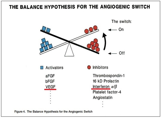 잠복해있던 미세암은 혈관신생을 막는 인터페론 등 면역물질들과 혈관신생을 촉진하는 VEGF 등 물질들이 균형을 이루고 있다가, 저산소증으로 VEGF 등의 물질이 많아지면 “Angiogenic switch”가 켜지면서 혈관신생이 시작된다 (아래그림) [9,15].