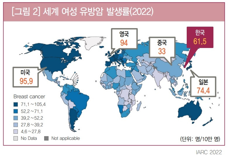 현재 한국의 20대 여성 13명 중 1명은 살면서 유방암 환자가 된다 [49]. 미국의 경우 8명 중 1명 꼴이다 [50]. 한국인 유방암 발생률은 10만명당 61.5명으로 아시아 국가 중 최상위 그룹에 속한다 [51].