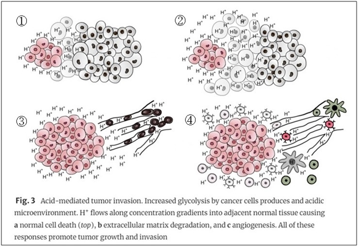(*그림설명: 1. 암세포가 주변환경을 산성으로 만든다. 2. 산성 물질이 정상세포 및 주변 조직을 파괴한다. 3. 혈관신생이 가능해진다. 4. 암의 성장과 전이가 쉽게 이루어진다.)