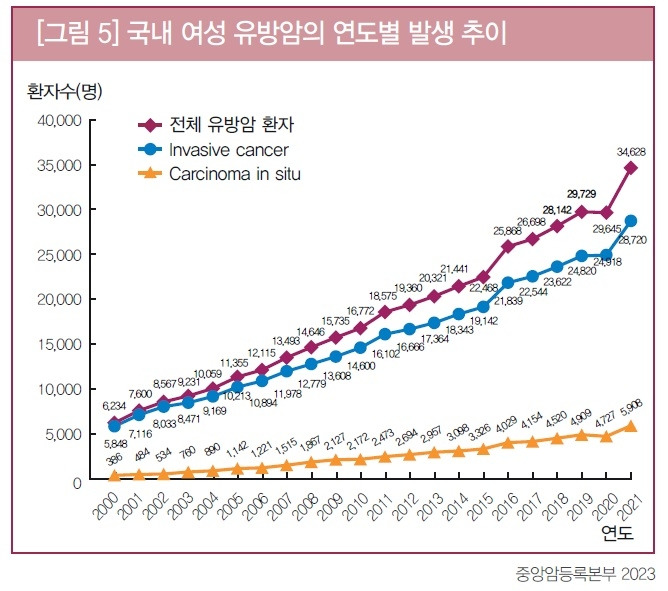 한국에서 유방암 환자는 지난 20여년간 무려 5배나 증가하였고, 앞으로도 계속 더 증가할 것이다 (아래 그래프) [48].
