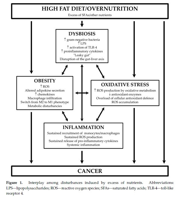 과다 섭취된 지방은 장내세균 불균형(dysbiosis)을 야기하여 염증을 일으키고, DNA에 손상을 줄 수 있는 활성산소(ROS, reactive oxygen species)를 많이 만들어 암 발생을 촉진한다(아래도표). 지방의 종류가 중요한데 동물성 지방은 암 발생을 증가시키지만, 식물성 지방은 암 발생을 오히려 감소시킨다 [39].